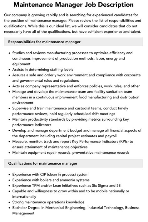factory maintenance manager job description. There are any references about factory maintenance manager job description in here. you can look below.