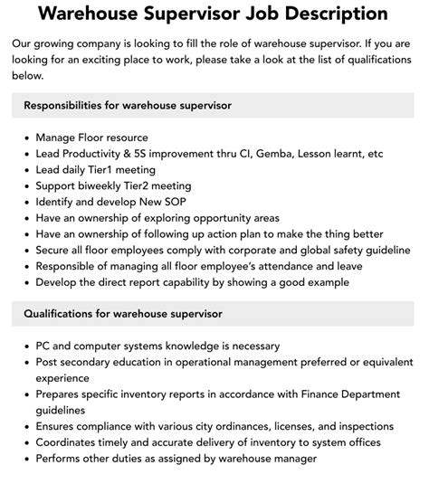 warehouse supervisor duties. There are any references about warehouse supervisor duties in here. you can look below.