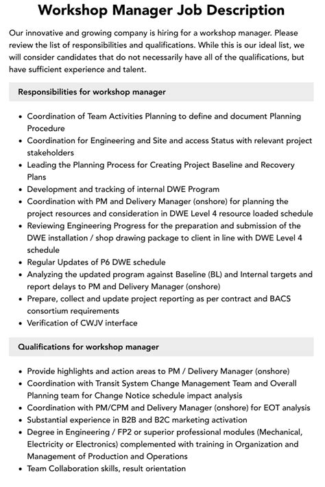workshop manager job description. There are any references about workshop manager job description in here. you can look below.